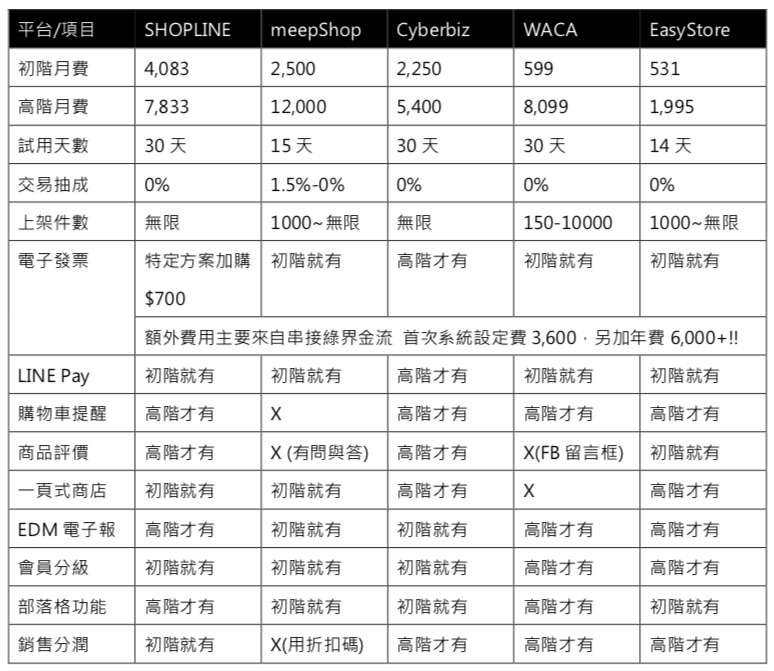 - 各家方案可能分成多達1-5種方案,SHOPLINE今年也將部分功能改為「加購制」,因此上表僅分初階標配,只要超過初階方案或加購才能擁有的功能,都列為高階,有興趣者可以前往各開店平台官網了解。